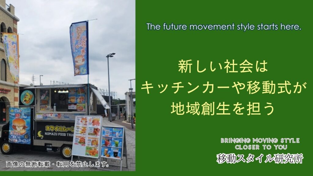 新しい時代に突入し、キッチンカーや移動式販売やサロンカー・移動理美容車など様々な移動カーが地域の傍らに共生して、移動カーのインフラ化が加速する社会へ順応できるように教育して、より人間社会とデジタルを融合したハイブリッドな移動ビジネスをご提案し、地域や企業などにお手伝いをしております。